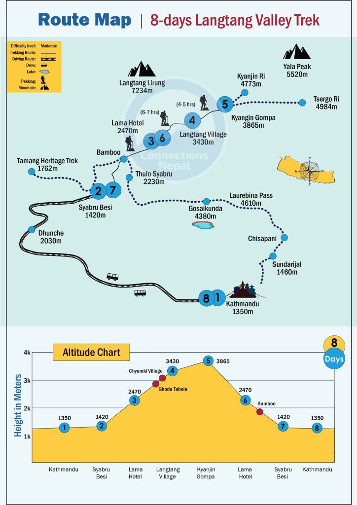The highest point is Kyanjin Gompa (3,865m/12,680ft).