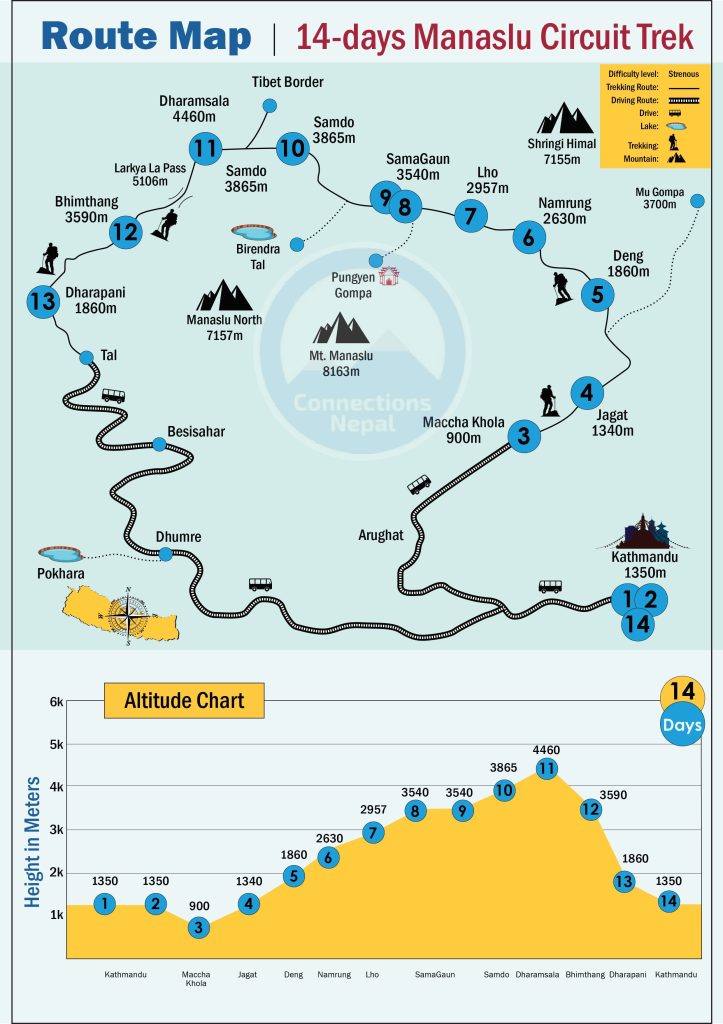 Your journey will start  from the scenic drive from Kathmandu to Soti-Khola, walking through the terrace fields,beautiful waterfalls, you will reach to Machha-Khola ,Next morning you will start a walk to Machha-khola to Philim with the stunning view of Mount Shringi Himal and Ganesh Himal you will stay overnight at Philim and continue walking to Deng, Namrung To Sama-Goan,you will acclimatization at Samagoan and go kike for Birendra Tal and Manaslu Base camp and return back to lodge in Samagoan for overnight stay. Further we walk to Samdo,Samdo is the Tibetan Village from where you can see stunning view of  Mount Manaslu, then walk to Dharmasala,Next day you pass the Larle La Pass,the longest pass in Nepal Himalaya, From Larkya La pass you can see majestic view of Mount Himlung,Mount Annapurna II,Mount Kang Guru,then descends back to Bhimthang for overnight stay. After breakfast you will walk to Dharapni following the Marshyangdi river and beautiful snow-capped mountains. Next Day you will take a Jeep/Bus to Besisahar to kathmandu.